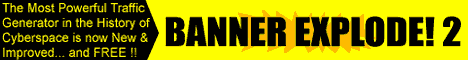 Remember to display the banner prominently... the more people who click this banner and go to your explode.html page, the larger your downline, and the more traffic you'll ultimately get to your main page! For best results, use multiple banners: place horizontal banners at the top and bottom of your main page, and place the square banners in the left and/or right columns of your page. Also place banners on as many of your subpages as possible!