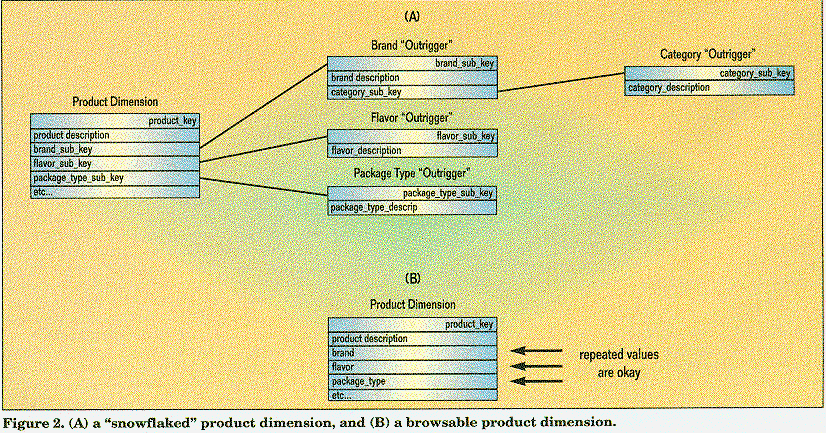 If the dimension tables are normalized into typical "snowflake" structures, as shown in Figure 2, two bad things happen. First, the data model becomes too complex to present to the user. Second, linking the elements among the various branches of the snowflake compromises browsing performance. Even when a long text string appears redundantly in the dimension table and can be moved to an "outrigger" table, you won't save enough disk space to justify moving it. The fact table is always overwhelmingly the largest table in a star join schema. In many cases, normalization can actually increase the storage requirements. If the cardinality of the repeated dimension data element is high (in other words, there are just a few duplications), the outrigger table may be nearly as big as the main dimension table. But we have introduced another key structure that is now repeated in both tables.