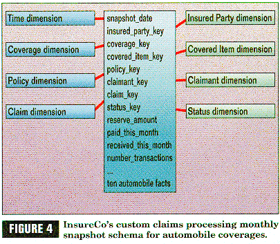 Second, the users needed to view the business in monthly intervals. Claims needed to be grouped by month, and compared at month's end to other months of the same year, or to months in previous years. This conflicted with the need to store every transaction, because it was impractical to roll-up complex sequences of transactions just to get monthly premiums and monthly claims payments. Third, we needed to deal with the heterogeneous nature of InsureCo's lines of business. The facts recorded for an automobile accident claim are different than those recorded for a homeowner's fire loss claim or for a burglary claim.
