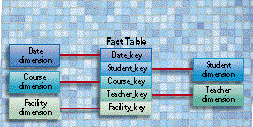 Date: one record in this dimension for each day on the calendar Student: one record in this dimension for each student Course: one record in this dimension for each course taught each semester Teacher: one record in this dimension for each teacher Facility: one record in this dimension for each room, laboratory, or athletic field