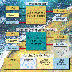 The requirement to conform dimensions across data marts is very strong. Careful thought must be given to this requirement before the first data mart is implemented. The data mart team must figure out what an enterprise customer ID is and what an enterprise product ID is. If this task is done correctly, successive data marts can be built at different times, on different machines, and by different development teams, and these data marts will merge coherently into an overall data warehouse. In particular, if the dimensions of two data marts are conformed, it is easy to implement drill across by sending separate queries to the two data marts, and then sort-merging the two answer sets on a set of common row headers. The row headers can be made to be common only if they are drawn from a conformed dimension common to the two data marts. (See Figure 2.) I first described Drilling Across in my March 1996 column. (See "Drilling Down, Up, and Across," DBMS, March 1996, page 14.)