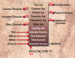 Step 5: Storing Precalculations in the Fact Table. A common example of the need to store precalculations occurs when the facts comprise a Profit and Loss statement. This situation will often arise when the fact table is based on a customer bill. Figure 3 shows the fact table starting off with the Quantity Sold and the Extended List Price. Both are beautiful additive quantities, from which you can always derive the average unit list price after you have added up some number of fact table records. Of course, the customer doesn't usually pay the list price. You need to subtract any discounts and allowances to arrive at the Extended Net Price. Because the Extended Net Price can always be derived from the Extended List Price minus the Allowances and Discounts, do you need to store the Extended Net Price explicitly?