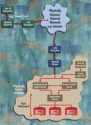 If you keep your copies of DBMS, go back to the January 1997 issue. The Internet Systems supplement contains a very elegant glossy foldout, courtesy of Open Horizon Inc., that has a security network diagram consistent with Figure 1. (If you can't find the foldout, you can get a new one by calling Open Horizon at 415-869-2200.) The foldout shows most of the current security buzzwords. If you use Pfleeger's book to learn what all the buzzwords mean, you will be in a good position to hire a consultant to help you design your data warehouse system to be resistant to hackers, crackers, and industrial spooks.