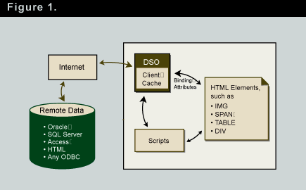 Figure 1 displays the major architectural landmarks of data binding. A data source object (DSO) sits on a Web page and holds a local data cache. It also links to remote data sources over the Internet or an intranet. Binding attributes link the DSO�s cache to HTML page elements such as td and input type=text. Scripts enable user interactivity with the local cache.