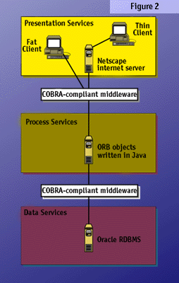 Distributed Objects. The wave of the future, distributed objects are just now becoming realistic. The main object-oriented middleware products are governed by the universally accepted Common Object Request Broker Architecture (CORBA), a product of the Object Management Group (OMG). The number of CORBA-compliant tools is growing daily; many vendors consider it the most open and complete mechanism for three-tier objects. Other (competing) standards include Microsoft's OLE/DCOM (Distributed Component Object Model) one-two punch and Java's Remote Method Invocation, which is built into version 1.1 of the Java Development Toolkit.