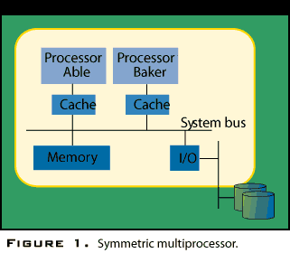 An SMP is a single computer with multiple equal processors, period. There are no multiple "anything elses"--no multiple memories, I/O systems, or operating systems. The word equal--as well as the word symmetric in the name--means that any processor can do what any other processor can do. All processors can access all memory, perform any I/O operation, interrupt other processors, and so on. That's what the hardware tells the software, anyway. In reality, the hardware continually "tells a lie" about one key aspect: There really are multiple memories in SMP.