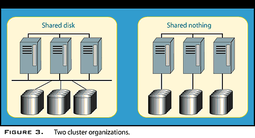 Clusters are interconnected in many different ways; the two most common variations are shown in Figure 3. Some form of direct machine-to-machine communication is almost always involved. It can be as simple as Ethernet or as complex as a high-speed, hundreds-of-megabytes-per-second network such as those used by IBM's RS/6000 SP, Digital's Memory Channel-based systems, or Compaq Computer Corp.'s (once Tandem's) ServerNet. In addition, the computers of a cluster often, but not always, allow any member of the cluster to get to any disk through I/O switching--whether through multi-initiator SCSI or SSA, a fibre channel switch, or proprietary means. That doesn't mean the computers necessarily "share" the disks in any meaningful sense; that's up to the database or other subsystem, and most of them adhere to a shared-nothing philosophy in which only one computer "owns" a disk at any time. Oracle8 and IBM S/390 DB2 are exceptions; they actively share disks--in effect treating them as big, slow memory on which database cache coherence is maintained.