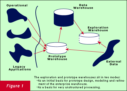 Unlike the exploration warehouse, the prototype warehouse is used in the mode of providing a "what if" foundation for the initial building of the enterprise data warehouse. The prototype warehouse is fed directly from the legacy systems environment and possibly from external data as well. When used in this manner, the prototype processing done by the end user is one that forms the basis for design for the enterprise data warehouse.