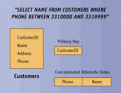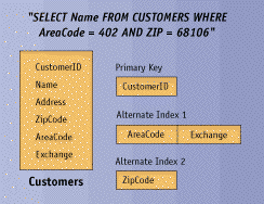 You can also combine indexes to minimize row fetches. Consider another example involving a self-join for which you want to select on a telephone area code and a zip code. The table in Figure 2 has two alternate indexes in addition to a primary key. One alternate index consists of the concatenation of the AREA_CODE and EXCHANGE columns. The other alternate index is on the ZIP_CODE column. When Oracle's optimizer analyzes the SELECT statement, it sees an AND-EQUAL condition. That is, the optimizer determines that both elements of the WHERE clause use equality operators and both use indexes. Normally, the database would fetch the rows associated with each index and combine them afterward. In this case, Oracle will combine the results from two indexes before fetching rows, which may well result in fewer row fetches than would happen if the results were combined after the fetching.