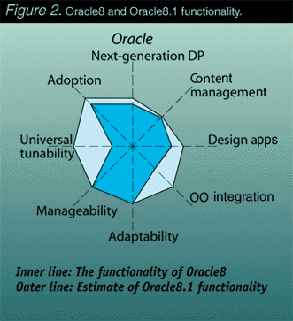 As illustrated in Figure 2, Oracle8.1 will likely add extensibility support that enables additional tuning options and the development of third-party extensions (cartridges) similar to Informix's DataBlade modules. In the meantime, Oracle has the opportunity to sell practical object/relational technology in the mainstream, potentially outflanking the more niche-oriented marketing of IBM and Informix. It is unfortunate, however, that Oracle (like Informix but unlike IBM) has chosen to offer Oracle8's object/relational functionality as a separately-priced option. This strategy may deny many mainstream IT users the opportunity to experiment with the functionality, and tends to encourage the view that object/relational technology is suitable only for early adopters.