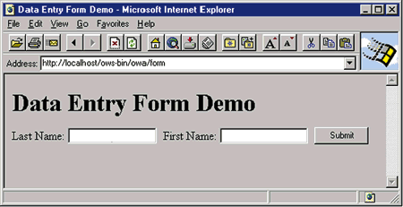 Form processing with the PL/SQL Agent requires two stored procedures. The first procedure presents the form onto the browser to accept the input; the second processes the information when it is submitted. The first procedure is shown in Listing 3 ; it generates a form containing two fields.