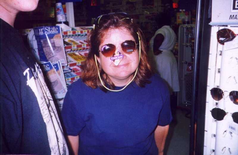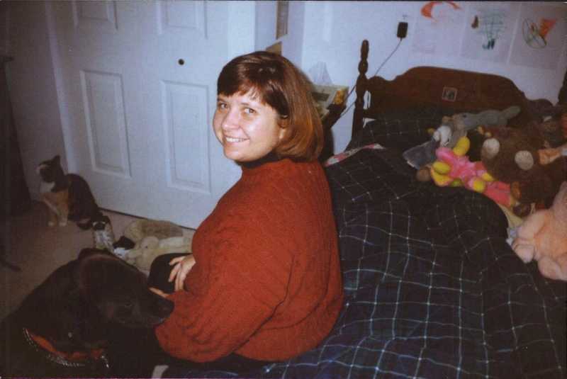 Mommers sitting on my bed. Wearing a snazzy red sweater. Mommers trying on sunglasses. What an expression.