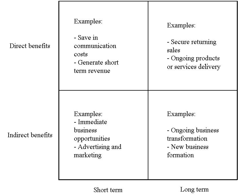 An interesting finding during the case study interview was that the participants often translate perceived benefits into competitive advantage. At this stage, none of the participants was keeping records on how much the Internet helped to bring in new business or boost sales. The reason for this lack of records was due to the difficult causal relationships in the new electronic commerce model. For example, acquisition of a product or service often involves a number of stages including: information gathering, option evaluation, bargaining and negotiation; then payment, delivery and post-sales support. Customers may use the Internet for only part of the purchase cycle (e.g. a walk-in customer who gathered information over the Internet before coming into the shop). Also, many small business owners were interested in the potential of the Internet as much as the immediate cost savings ability. One participant asserted that having an Internet (e-mail address) connection was as necessary as the need for a fax number. It is difficult to quantify how much business the fax service can bring in, but it is essential to have a fax machine in most businesses. This will be similar in the near future for the Internet. In fact most of the small businesses we interviewed indicated that savings or earnings directly from the Internet were marginal. However, they unanimously agreed that as long as they can afford the access and service charges, they would keep the Internet connection despite the fact that it was not immediately justifiable in a cost/benefit perspective. Based on the participants' responses, we classify perceived benefits into direct and indirect as well as long- and short-term (see Figure 1).