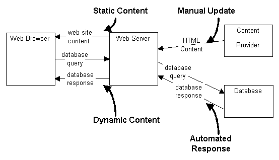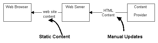 The problem with the first-generation Web application is that the information is static. Fixed content on the Web site means more activity on the part of users to find what they are looking for. Fixed content also requires changing the HTML formatting on the page itself in order to update the content. On Web sites containing a lot of content, this becomes an expensive proposition because the work is slow and labor intensive. Figure 1 shows the data flows for a typical first-generation Web application.