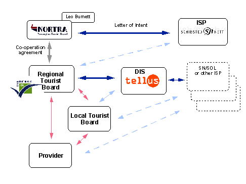 The project has also established cooperation with two main technical partners--an ISP and a provider of DIS (Sheldon, 1993). The national ISP contributes technical and marketing expertise for using the application on the Net. Initially, the national ISP intended to contribute economically to the project since tourism was also part of their strategy for establishing new business on the Net. This intention changed for different reasons during the first phase of the project, and the tourism industry is taking over the costs, ownership, and responsibility for the solution. At the regional and local level, the industry may chose any partner as ISP.