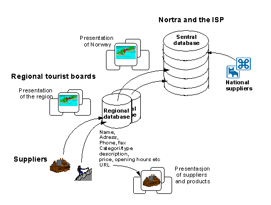 To implement the solutions based on the elements we identified in the pre-project phase, we made three main strategic decisions: to distribute responsibility for information to the regional level, to base the technical solution on regional Destination Information Systems (DIS), and to establish an alliance with a national ISP. The reasons for these decisions and our experiences from implementing them during the first phase is discussed in Aanonsen, 1997-1; how these related to relevant marketing and organizational theories in discussed in Tjostheim, 1997. The basic element of the organizational model is cooperation between tourist boards around the country. The Norwegian tourism business is organized as a hierarchy with NORTRA on top, then five regional tourist boards covering most of the country, a number of local tourist boards or "destination companies" on the next level, and suppliers at the bottom. Each regional tourist board is responsible for information from the region and for organizing further distribution of responsibility. The goal is to create a network where the responsibility is as close to the information source as possible.