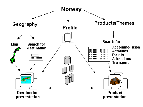 The tourist can find different types of information through this Web application. The information is divided into presentations of destinations and presentations of products and providers. The user can navigate through the information in different ways, either by geography, by product type, or through the profiling material (Aanonsen, 1997-2). The figure below shows how these three ways lead to the destination and product presentations. These two types of presentations are also connected directly. The connection makes it possible for the users to find all products in one destination and to navigate from a presentation of a product to the presentation of the destination where the product is situated.