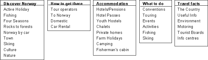 The Web pages in the application will normally consist of three parts, implemented as frames. A top field-frame will have "Norway" as a header, and four icons will be used for maps, search, languages, and home. There will also be a bottom field-frame containing five pop-up menus implemented in Java. The five menu headers are Discover Norway, How to get there, Accommodations, What to do, and Travel facts. The submenus can differ from destination to destination. At the national level, we have chosen the menu items shown in figure 4: