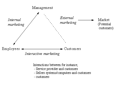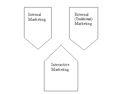 A recent article in HBR (Deighton, 1996), titled "The Future of Interactive Marketing," is nearly entirely about the WWW or marketing on the Web. Other similar articles could be mentioned. However, the term interactive marketing function was introduced in 1979 by C. Gronroos, one of the most prolific service marketing authors (Fisk, Brown, and Bitner, 1995). He states that "Advertizing and pricing may be handled as separate mass marketing activities, thus constituting a mass marketing function. The other marketing function is the management of the buyer/seller interactions, and it can be labeled the interactive marketing function" (Gronroos, 1979). Later, the concept internal marketing was introduced (Gronroos, 1981), and the mass marketing function was replaced by the term external (traditional) marketing. In internal marketing, the employees are seen as customers within the corporation. The three components--internal, external, and interactive marketing--constitute the marketing model presented (Gronroos, 1990, p. 258) in figure 5: