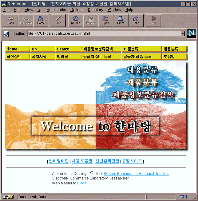 Figure 1 is HANMADANG's starting home page for Korean language users. HANMADANG is still at the experimental stage and some parts are still under construction. This service will be publicly available at <http://cals.seri.re.kr/> on 1 March 1998.