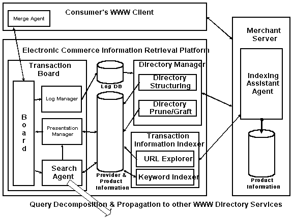 Finally, the presentation manager sends the result to the merge agent in the customer's browser. The merge agent is a plug-in program of the browser for merging the search results from the various directory services. The directory manager performs the role of gateway which bridges between Web and database. The directory structuring unit maintains the structure of the directory graph, and the directory prune/graft unit dynamically creates/removes the nodes of the directory structure, if needed. All of the index data will be stored into the provider & product information database. The log manager and the log database are for a user's query history and statistical data.