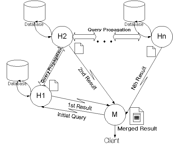 Let the number of HANMADANG servers be n. User query is a set of nouns and proper nouns like "Sam-Sung 29 inches TV." When the customer's client in which the merge agent M is plugged browses to HANMADANG search agent #1 (H1) and gives the query and satisfaction threshold t (the number of URLs to find), H1 looks into its local database at first. All databases are specialized for certain products so as to avoid redundancy. When the result is not satisfactory with the threshold, it propagates its query, customer's URL and the modified satisfaction threshold to another HANMADANG search agent H2 and sends the result to M. H2 will do the same job like H1. If the result is satisfactory this time, the entire search flow will stop and H2 will send its own result back to M. If H2's result is not satisfactory and there are no search agents to ask, H2 will send STOP message. Finally, M merges the results from HANMADANG servers over the network. M stops merging when the number of merged URLs is over the satisfaction threshold, and sends them back to the customer's client in HTML form. If M gets STOP message, it will stop merging. Also if there is a time-out, it will stop.