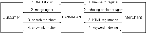 The indexing assistant agent is for performing IOD and maintaining the time schedule in the merchant's server. It can be installed automatically with the merchants' permission when they first register on the HANMADANG directory service. When the merchant demands his site to be indexed or updated, the agent notifies the HANMADANG's indexer.