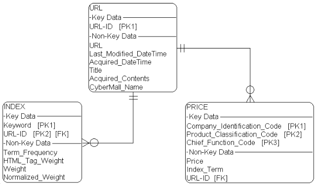 In the URL table, the key field is URL-ID, which is an URL of the indexed document. URL itself is unique, but not suitable for using as a key because of its variable length. Last_Modified_DateTime is a date field for storing the date and the time when the URL document is last modified. Acquired_DateTime is a date field for storing the date and the time when the URL document is first acquired. Title is a <TITLE> tag string. Acquired_Contents is a VARCHAR2 field (unique in ORACLE Version 7.3). The value of this data type is a variable length character string of maximum length 2000. Acquired_Contents is a subset of the document text to which URL-ID points. CyberMall_Name is the name of the cybermall where URL is included.