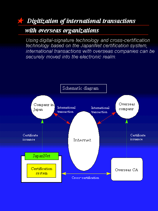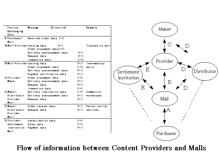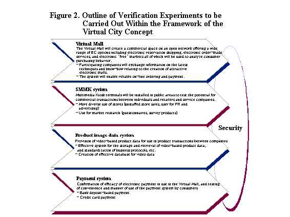 In particular, electronic commerce will make it possible for producers and consumers to conduct key stages of a merchandise transaction over the Internet or through other network channels: from advertising to sales to settlement. In our view, that will help boost the efficiency of merchandising, bring about needed structural reforms in the distribution and retailing sectors, and add to the overall benefits enjoyed by consumers. MITI has therefore earmarked 10 billion Yen in funding from the first supplementary budget for a series of testbed projects aimed at developing and testing the technologies essential to making EC a reality. Those projects will be farmed out to a consortium of 19 firms. Ultimately, MITI plans to conduct one of the world's largest testbed undertakings, with the participation of over 500,000 consumers and more than 350 individual companies.