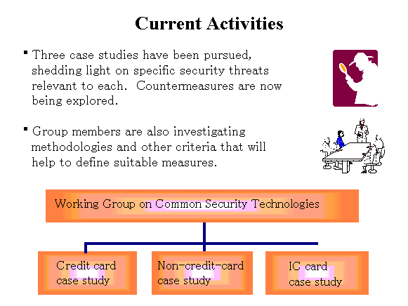ECOM has set up the following working groups to look into the problem of security from various different angles: Working Group on Common Security Technologies, Working Group on Personal Authentication, Working Group on IC Cards, Working Group on Certification Authority.