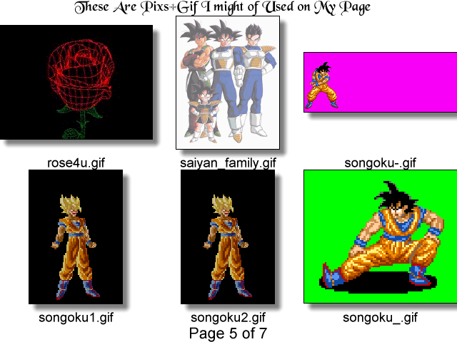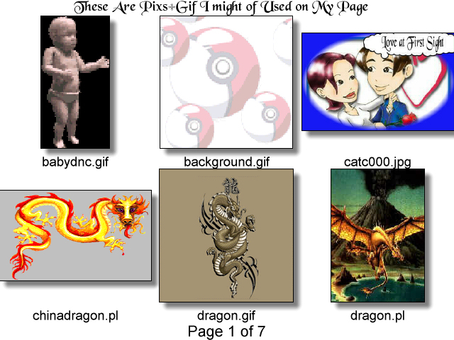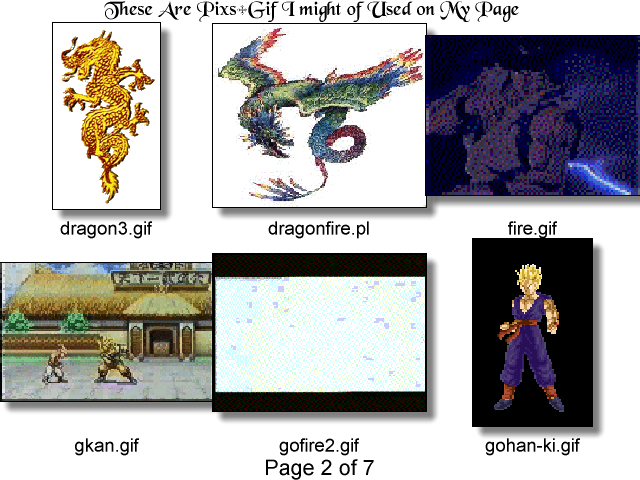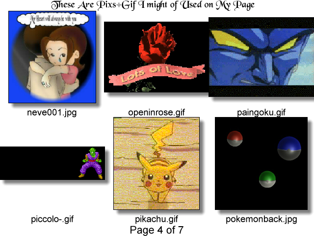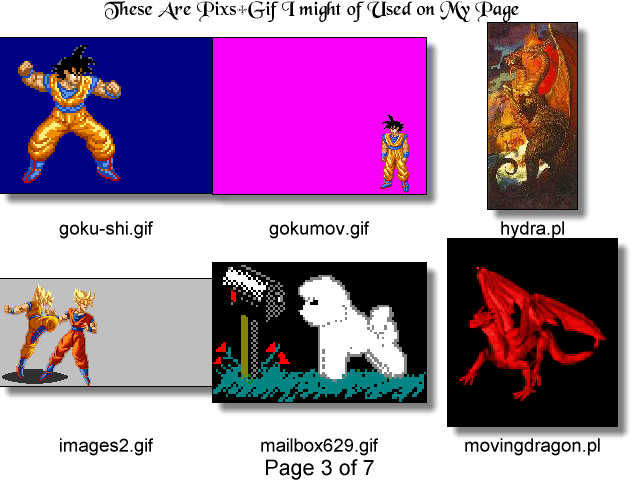 These are the pages of Gif file+Pixs that I might or might not have used on my page. You can't really save these because I edited these pix+gif file into one page. If you try to save these pix one by one it will not do anything, because all these are on 6 different page. If you save it you would save the whole page instead of one by one. So I suggest not to save any. If you like any pix or gif file from my page you can right click on the mouse and save it to your disk Since I formated a lot of graphic file into one page. It will take awhile to load so go get something to eat or drink. Don't forget to put a little note in my G-book. ENJOY!!!