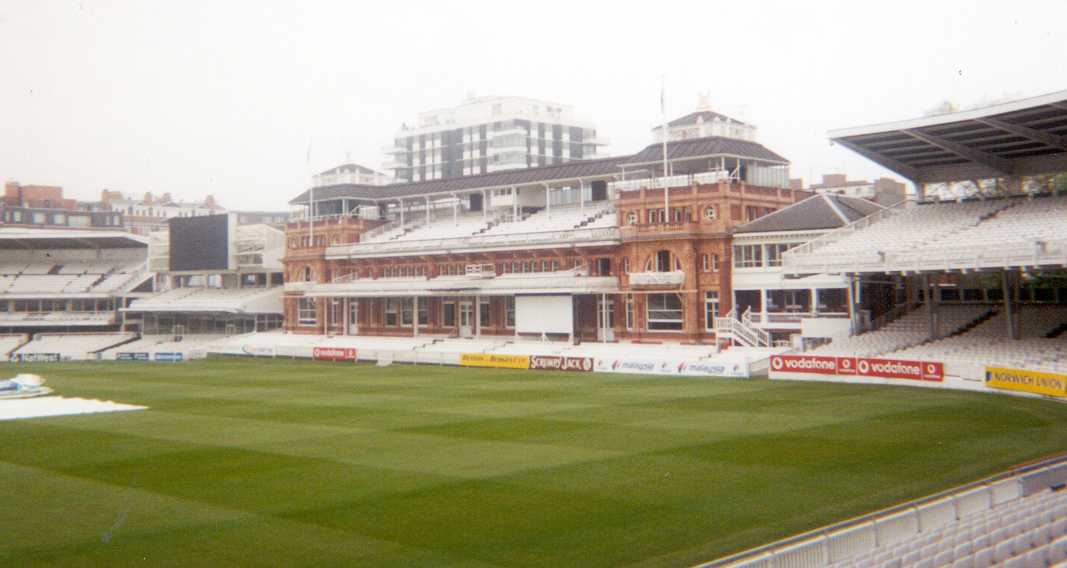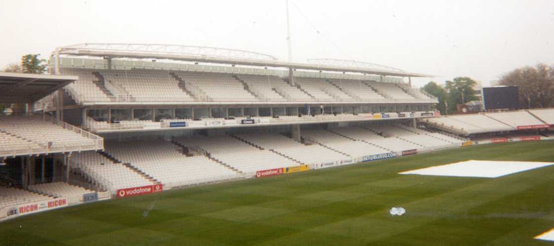 The famous M.C.C. section of the ground. On both sides, are the changing room of both teams, on the middle layer is where the presentation occurs, and when a batsmen gets out, he walks into the changing room, where the red vodafone advertising board is located (in the center) and, only M.C.C. members can sit in this section, and to watch a game, men's have to be in a suit, and women is proper business cloths (true cricket fans aren't they?)