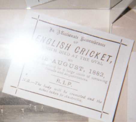 "In remembrance of English Cricket, which died at the Oval on August, 1882 ... N.B. The body will be cremenated and the ashes taken to Australia."