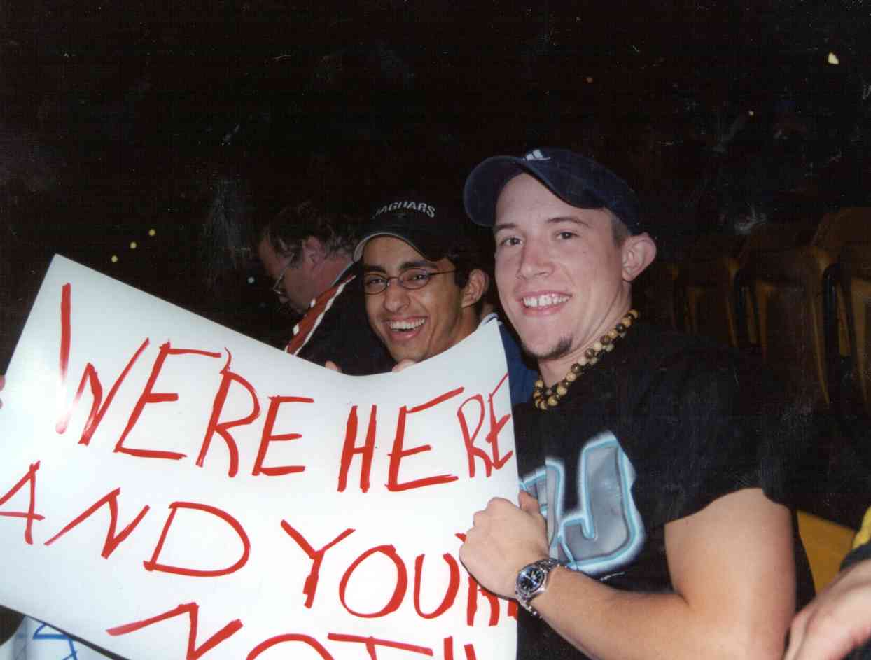 Jason, my friend from Switzerland, and myself. The sign made by him reads: "We're here and you're not!" Yes, the person next to me was in the influence of Alcohol and was escorted out by the police as the show progressed.