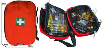 Outdoor First-aid Pouch : Features - two large main zipped mesh compartment to keep first aid kit. Zipped closure, hanging hook, belt loop and hand loop. Size 20cm x 6cm x 14cm