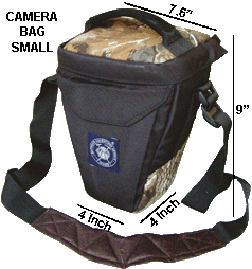 >>>>> SMALL:- Can carry an SLR camera with normal / wide / zoom lens Or a Handycam and filter and films. The strap system holds the bag snugly, this bag can be carried on waist belt and as a shoulder pack. Fully padded with 8mm thick insulation sheet. Coated nylon, water proof fabric is used. Size - 9" x 7.6" x depth 4" on bottom and 5" on top.