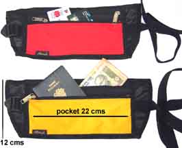 Thoughtfully designed Pouch has 2 zipped pockets and can accommodate a small handy camera, wallet and other needful things. Size 9" high, 13" wide and pocket + 4" depth.