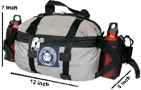 This waist bag is made of PU coated nylon fabric, features: large 7-litre main compartment with an external and one internal zipped pocket. Pockets to carry water bottle. The back and waist belt are fully padded for comfort. Side tension straps pull the load in tight. Shoulder strap included. Size 12" wide,7" high and 5" depth.
