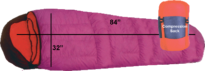 These mid-price range of sleeping bags are constructed with soft 210 nylon taffeta shells in Mummy Shape. Specification includes shaped box foot, one side full opening zipper, include nylon compression sack. 84" long x 32" wide size.