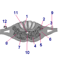 1- posterior funniculus (entire area) 2- dorsal root entry zone (DREZ) 3- dorsal horn (left) 4- anterior horn (left) 5- intermediolateral horn (only thoracic and upper lumbar levels) 6- lateral funiculus 7- anterior funiculus 8- anterior horn (right) 9-dorsal root 10- anterior gray commissure 11- central canal 12- dorsal root ganglion.