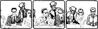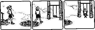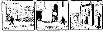 Упражнение 14. Сначала продумайте содержание кадра, то есть — какие события в нем будут происходить. Когда этот мысленный сценарий будет у вас готов, обратитесь к своим «актерам» и подробно расскажите им, что вы придумали. Актеры — народ весьма капризный, им может что-то не понравиться и все ваши старания пойдут насмарку. Если актеры предлагают вам что-то свое — соглашайтесь. В данном случае важно не содержание кадра, то есть не что именно вы будете снимать, а то, что вы вообще сможете снять постановочный кадр. Постарайтесь, чтобы в вашем кадре происходило как можно больше естественного движения: грубо говоря, актеры должны ходить, а не стоять или сидеть. Когда вы с исполнителями прийдете к консенсусу относительно сценария кадра, начинается самое сложное и интересное. Вы должны подробно представить себе, как действие будет выглядеть в кадре. Для этого следует нарисовать «раскадровку» — так называется несколько рисунков, на которых изображены начальная, средняя (одна или несколько) и финальная фазы кадра. Сколько именно должно быть рисунков? — Это зависит от сложности вашего кадра, если в нем появляется новый объект (или Объект) — нужен новый рисунок, а если вы делаете (например) панораму, то обязательно нужно изобразить ее начало, середину и конец.