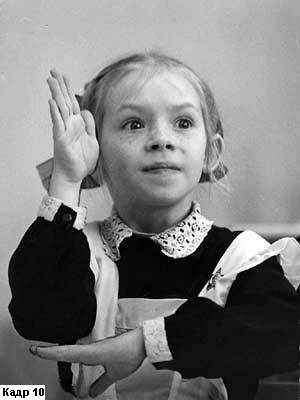 "Делай фигуры с такими жестами, которые достаточно показывали бы то, что творится в душе фигуры, иначе твое искусство не будет достойно похвалы". Так утверждал великий Леонардо еще пять столетий назад. Сегодня, благодаря видеокамере, оператор может сделать изображение жеста гораздо выразительнее, чем это доступно художнику, фотографу или скульптору. Ведь телеэкран передаст жест не только в момент наибольшей выразительности, но и на всем его протяжении, в развитии. Но такого результата достигает только тот, кто к этому стремится. Что, например, сделает неопытный оператор, снимающий школьный урок? Вероятно, он снимет достоверную, но, в сущности, ничего не выражающую "картинку", подобную кадру 7. Внимательный оператор сделает по-другому.