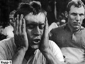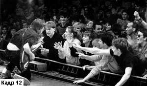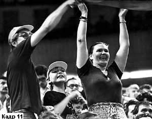 Так, например, при съемке спортивных болельщиков (кадр 11) оператору следовало сначала заметить тех, кто живо реагирует на происходящее, потом поставить камеру на штатив, скомпоновать кадр и ждать наступления острого момента соревнований, причем глядя уже не на болельщиков, а на спортивную площадку. Когда там будет назревать драматическая ситуация, следует начать съемку плана, который завершится проявлением бурных эмоций. Именно такая методика съемки позволит получить выразительный кадр, в котором, как и в случае со школьницей, будет зафиксирован не только итог, но и зарождение яркой эмоции.