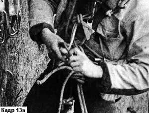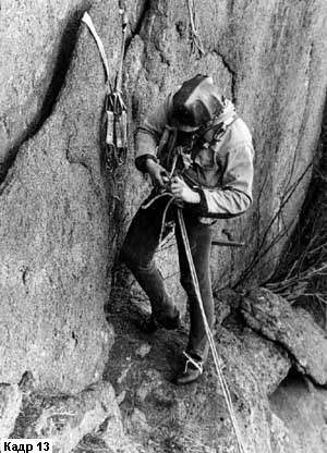 Человеческие руки бывают выразительны не только при энергичных движениях, вызванных какими-то чувствами героя. Обычно руки человека взаимодействуют с объектами его деятельности, с вещами предметного мира. На такие ситуации тоже стоит обращать внимание и выделять их из общей монтажной цепи кадров, снимая укрупнение (кадры 13 и 13а). Показав таким образом момент подготовки скалолаза к подъему по вертикальной стене, оператор не просто раскроет технологию этой подготовки, но и красноречиво скажет об опасности, которая подстерегает спортсмена, а стало быть изобразительно подчеркнет его мужество и мастерство.