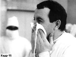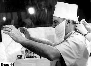 Иногда движение и просто положение рук говорят не только о сиюминутном состоянии человека. Бывают случаи, когда точно схваченный кадр помогает зрителю понять то, что происходило до момента съемки или то, что за ним последует. Кадры 14 и 15 совершенно очевидно свидетельствуют, что в одном случае сейчас начнется трудная работа хирурга, а в другом - что она только что закончилась. И все это зритель поймет, глядя на движение рук героя. Такие кадры выходят за рамки своего непосредственного содержания и вызывают у зрителя реакцию, которая гораздо богаче, чем простое восприятие показанного на экране действия. Кадры жестикуляции выглядят особенно выразительно, если оператор успевает снять их репортажно. Но если он не успел этого сделать, то иногда допустимо снять "дубль", то есть попросить героя повторить движение. Если это действие привычно герою, если не противоречит жизненной правде, то, как правило, зритель не заметит этой маленькой подтасовки.