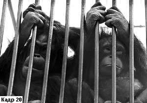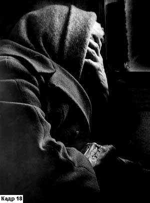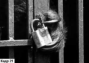 Руки человека могут красноречиво выглядеть и тогда, когда они находятся в бездействии. Если оператор укрупнит кисти рук, лежащие на коленях отдыхающей женщины (кадр 17), то эта деталь скажет о той долгой и нелегкой трудовой жизни, которую прожила героиня съемки. А в кадре 18 поза и рука с предельной выразительностью скажут о тяжких переживаниях. И эмоциональную силу этому кадру придаст именно то, что руки женщины неподвижны. Кстати, напомним еще раз, что категорически не рекомендуется создавать такие композиции, как это сделал оператор кадра 19, который "отрубил" кисти рук своего персонажа, не понимая, насколько выразительна эта деталь. "Рука - верхняя конечность человека" - так написано в энциклопедии. Но и у "братьев наших меньших" - у животных - тоже есть конечности и иногда они вполне могут быть достойны внимания оператора, превращаясь на экране в яркие, содержательные образы. Вот, например, планы, снятые в Московском зоопарке (кадры 20 и 21). Пальцы двух обезьян, с печальной обреченностью вцепившиеся в прутья клетки, и лапа медведя, лежащая на замке - оба кадра беспощадно свидетельствуют, что неволя - это тяжкая судьба для любого живого существа.