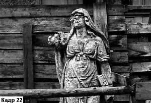 Руки - это настолько выразительные части тела, что они впечатляют даже когда они принадлежат не живому существу, а статуе. Мы уже видели это на примере скульптуры И. Мартоса. Вот еще кадр, говорящий зрителю о варварском отношении к памятникам (кадр 22). Отбитая рука стоящей фигуры как бы обращена к зрителю с вопросом: "За что?"
