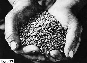 Человеческая рука может быть взята в кадр с предельной крупностью и такие композиции подчас приобретают самостоятельное, символическое значение. Их выразительности помогает то, что на картинной плоскости кадра остаются только те изобразительные компоненты, которые несут главную мысль. Никакие второстепенные детали при таком лаконичном построении кадра не отвлекают внимание зрителя и поэтому кадр легко воспринимается и не допускает иного толкования, кроме того, на которое рассчитывает автор (кадр 23).