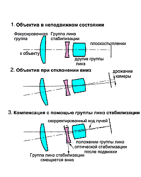 Стабилизатор изображения сдвигает группу линз объектива в параллельной к пленке плоскости. Когда объектив перемещается из за сотрясения, световые лучи от объекта (его изображение) сдвигаются относительно оптической оси, вызывая появление смазанного изображения.