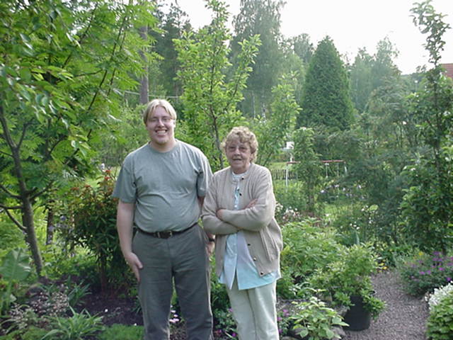 Markus tillsammans med sin mamma Kaarina i hennes trädgård.